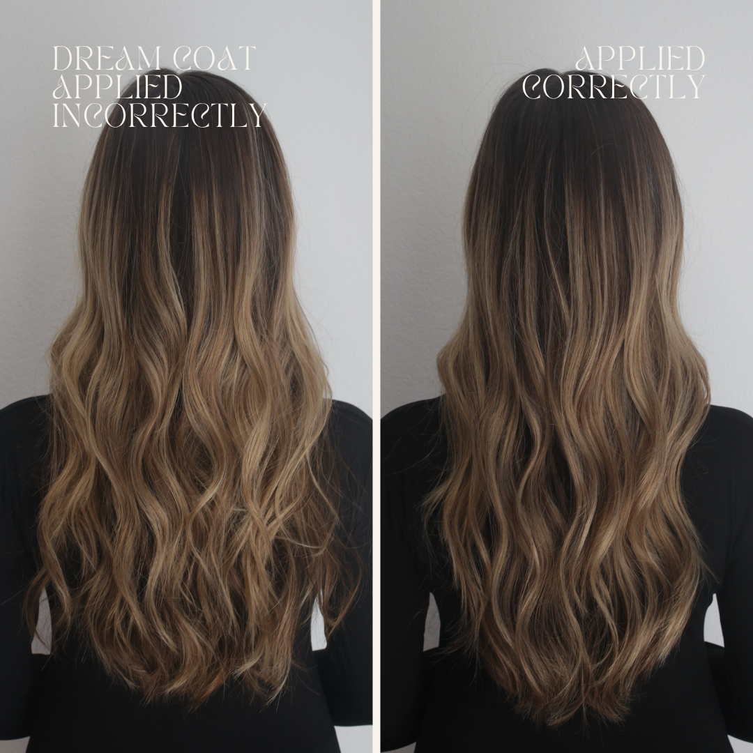 Avoid pretty much all leave-in products and keep your hair as clean as possible. Anything heavy (creams, leave-ins, oils), will block Dream Coat’s formula from properly coating your hair, hindering your results.