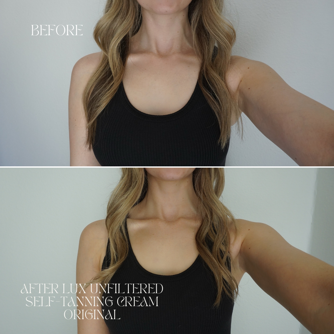lux unfiltered summer skin original hydrating gradual self-tanning cream before and after